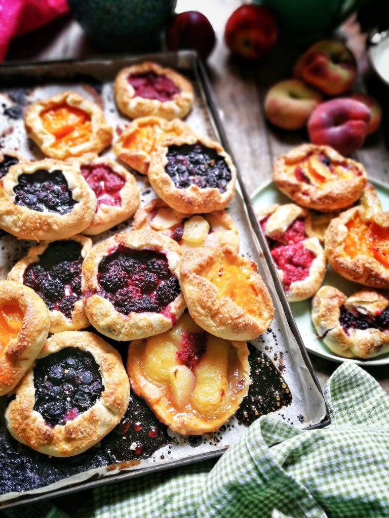 Si dovrà poi fare dei dischi (ognuno come crede, con tazze, tagliapasta, bicchieri…) non troppo piccoli di diametro perchè poi i bordi andranno girati all’interno. Posizionare al centro la frutta, spennellare con dell’uovo sbattuto e ricoprire di abbondante zucchero! Cuocere in forno a 180° per 20/30 minuti. Godevi questa leccandovi le dita zuccherate!