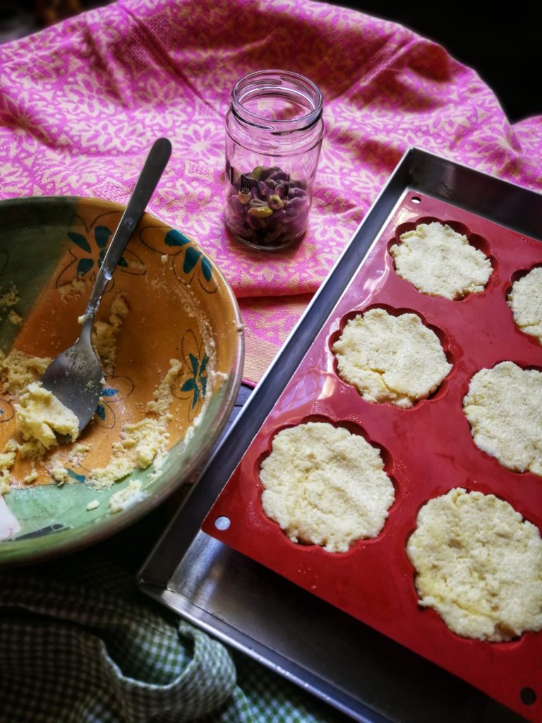 Alla base degli stampini mettere 3 pistacchi (ma va bene anche una mandorla, come si fa per la Basbousa) e versare l’impasto.