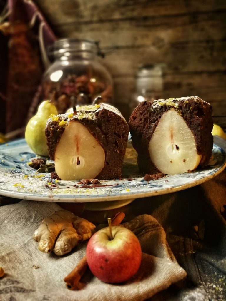 In una ciotola, aiutandosi anche con un frullino elettrico, mescolare burro, zucchero, uova, cioccolato e quando avrete un composto ben liscio aggiungete piano piano la farina mescolata con i lieviti. Nel caso l’impasto vi sembrasse denso aggiungete un cucchiaio dell’infuso di spezie. In uno stampo da plumcake sistemare le 3 pere in piedi e versare sopra il composto. Cuocere in forno a 180° per circa 50 minuti.